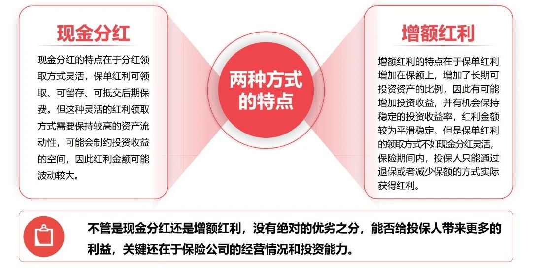 市面上常见的是现金分红和保额分红,两者区别下图: