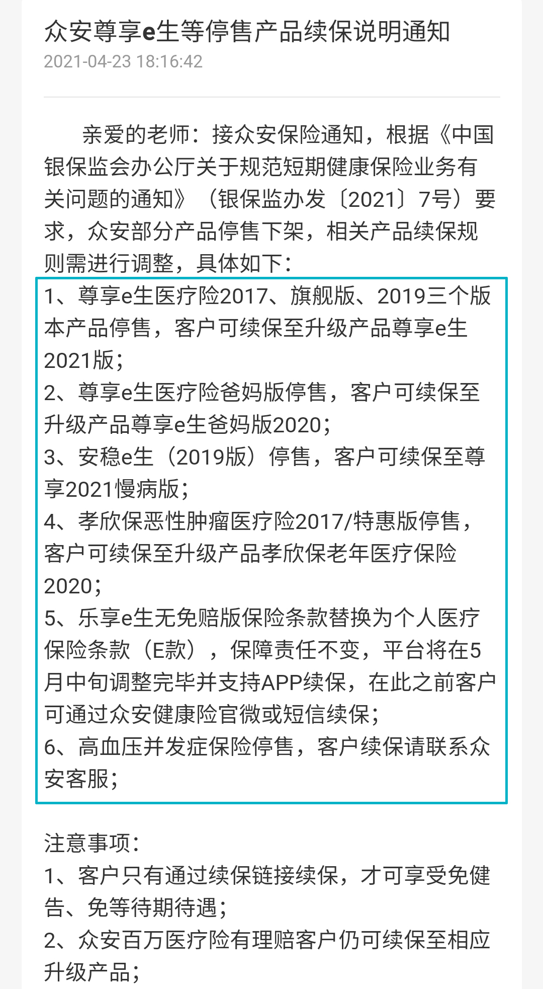 其次,并不是所有的1年期健康险都会停售。宣传页面和条款整改后,符合监管要求的,5月1日后也能正常销售,比如我们最熟知的尊享e生2021版。