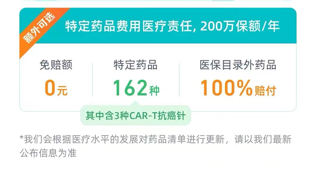 投保时建议一定要附加上,保162种特定药品,其中含3种CAR-T抗癌针,0免赔,报销比例100%(医保目录内药品,未用医保先结算,报销比例降为60%),每年最高报销200万!