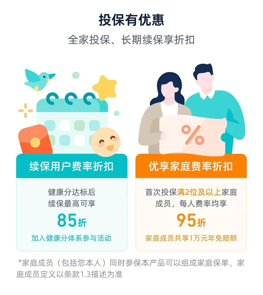 蓝医保每年只需要181元起,即可解决大病住院风险。续保用户最高可享85折费率折扣,若2位及以上家庭成员一起买,每人都能享受95折的费率折扣。同时,1万免赔额也可家庭共享,理赔门槛相对更低。