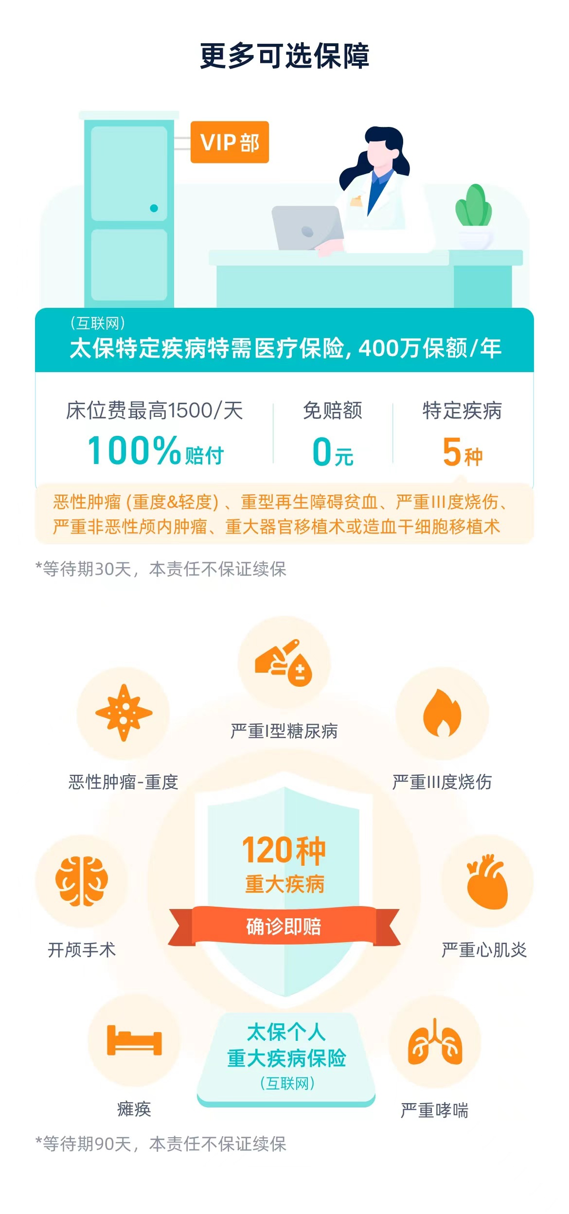 太保特定疾病特需医疗保险:报销5种特定疾病(包括癌症)在特需、国际、VIP部的治疗费用,适合对优质医疗资源有需求的人。
