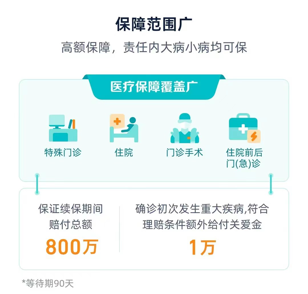除外之外,还能报销质子重离子(国际公认放疗先进技术)医疗费用,100%赔付。另含1万重大疾病关爱保险金,若确诊初次发生重大疾病,符合理赔条件,就一次性获赔1万,弥补免赔额的不足。