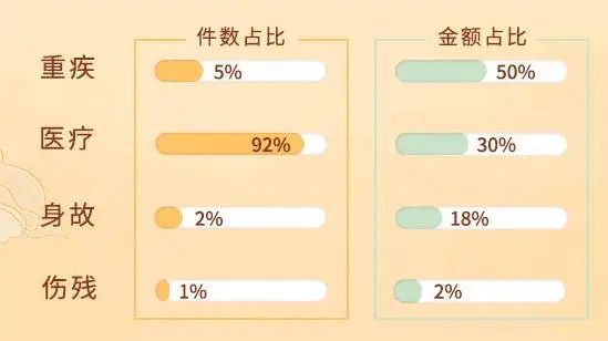 医疗的理赔件数占比最高,但从理赔金额高,重疾基本高居第一!原因也很简单,重疾每件赔得多!