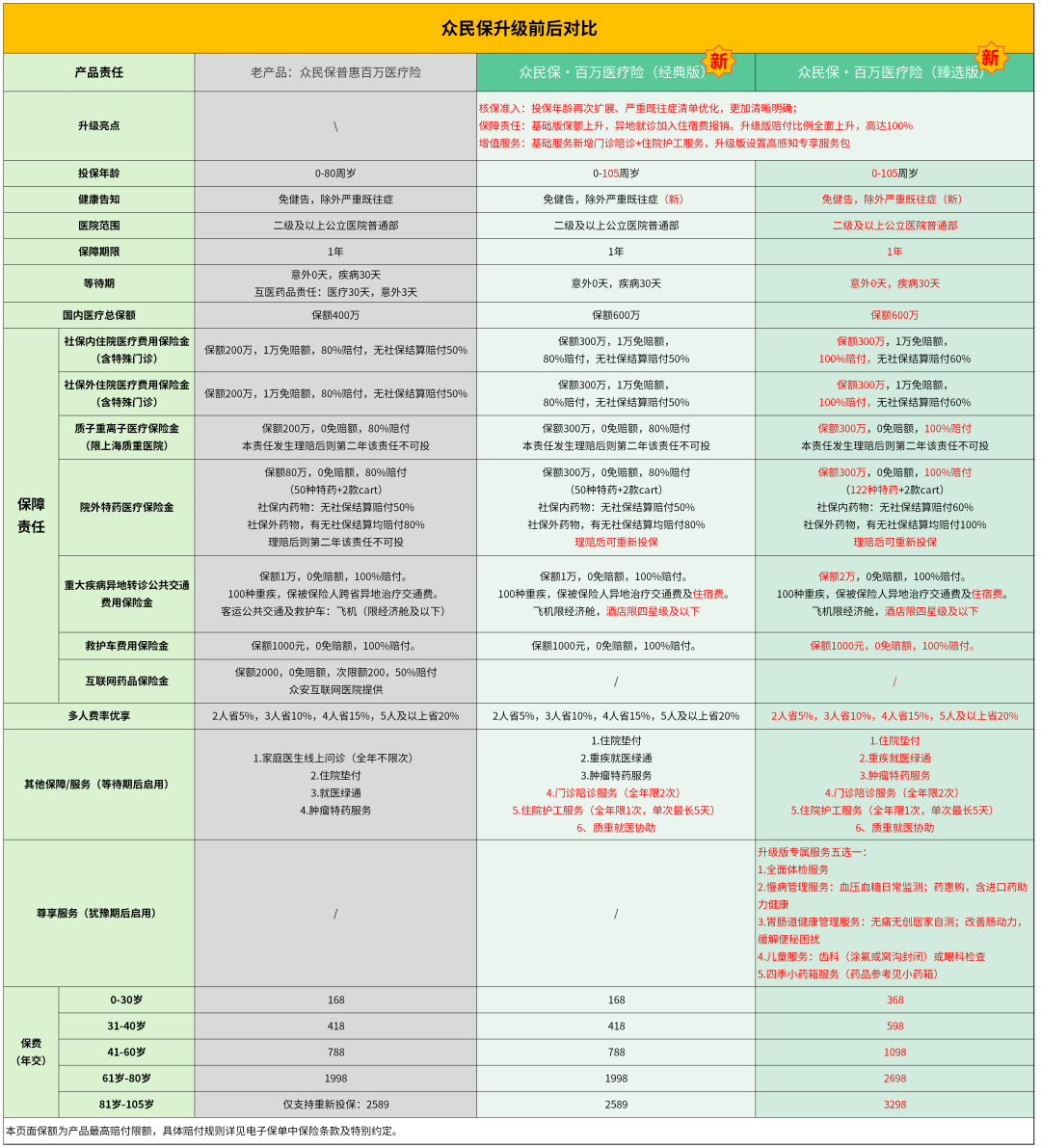 众民保老版本只有1个保障计划,新版本则有2个计划供选择——经典版和臻选版,其中经典版与老版本的价格完全一样,只是投保条件和保障范围有变化,臻选版赔付比例提升,高达100%。