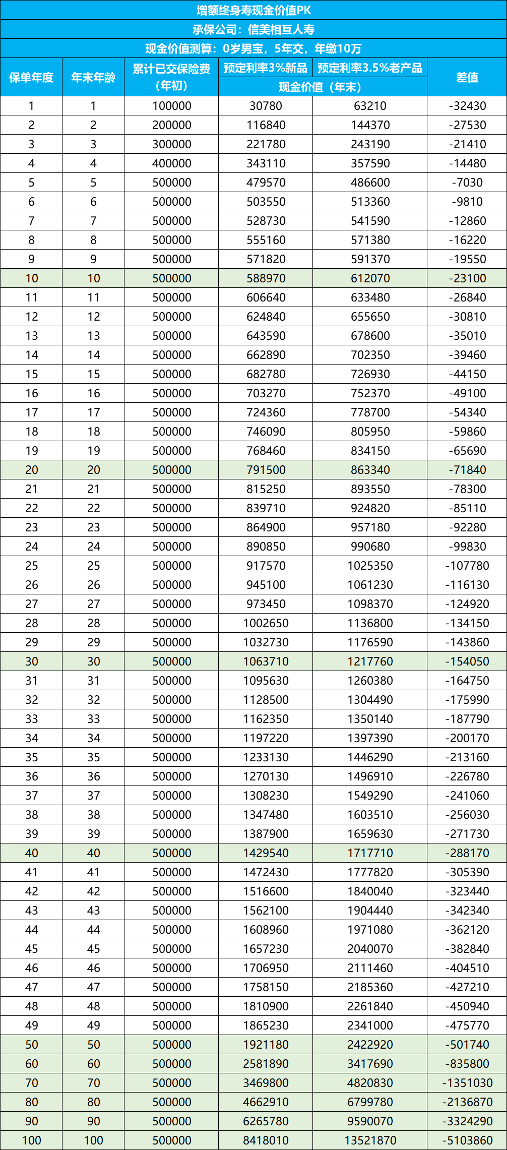 以0岁男孩,年交10万、交5年为例:在总保费50万的基础上,持有10年,现价少了2.3万;持有20年,现价少了7.18万;持有30年,现价少了15.4万……持有60年,现价少了83.58万。