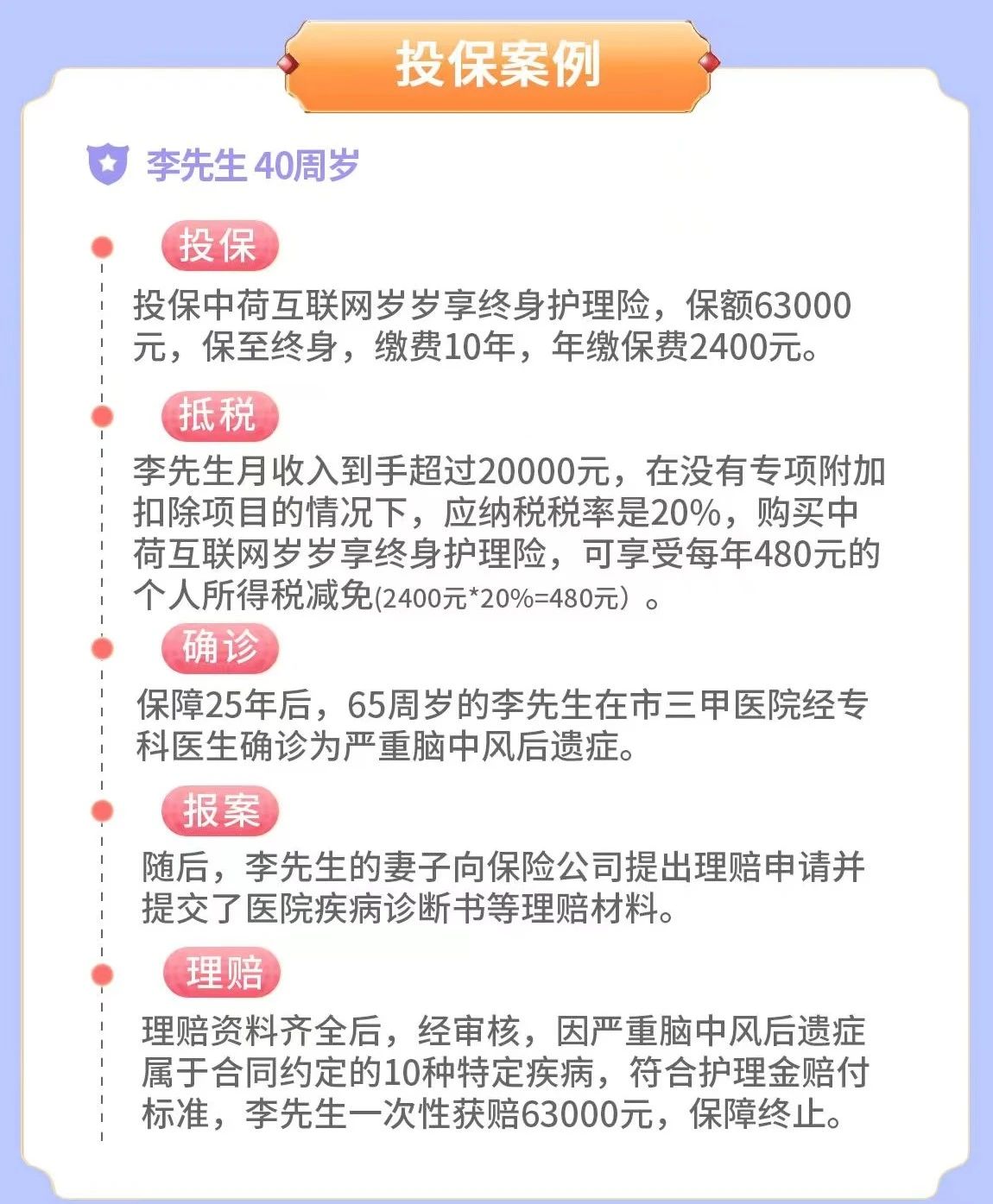 中荷岁岁享护理保险是一款税优健康险,投保享个税优惠政策,保费抵扣个税,最高额度2400元/年,收入越高,实际节省的税越多,最高省税1080元。你能节省多少税,看下图轻松读懂: