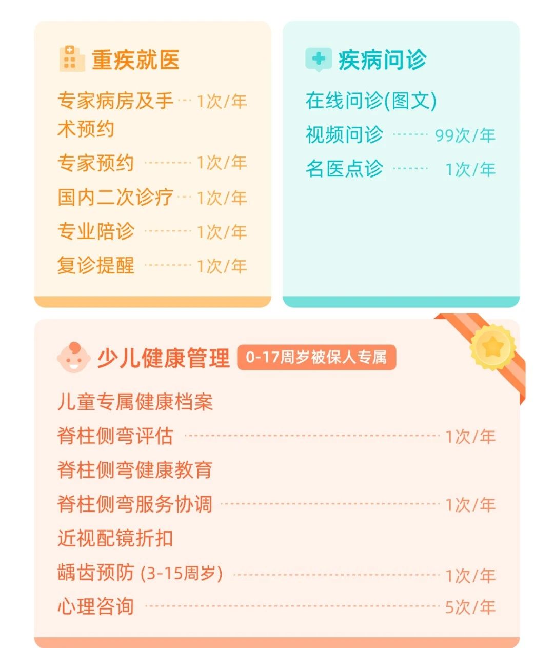 如果家里有小孩的话,孩子近视、龋齿、脊柱侧弯是常见毛病,这款产品提供儿童龋齿预防、近视配镜折扣、脊柱侧弯康复等服务,超级实用!