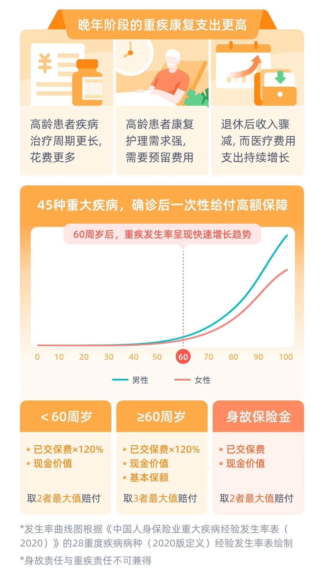 60周岁前它的现金价值增速快,拥有充裕的“蓄水池”,满足应急需求;60周岁后疾病高发期,它能够提供重大疾病的高保额保障。