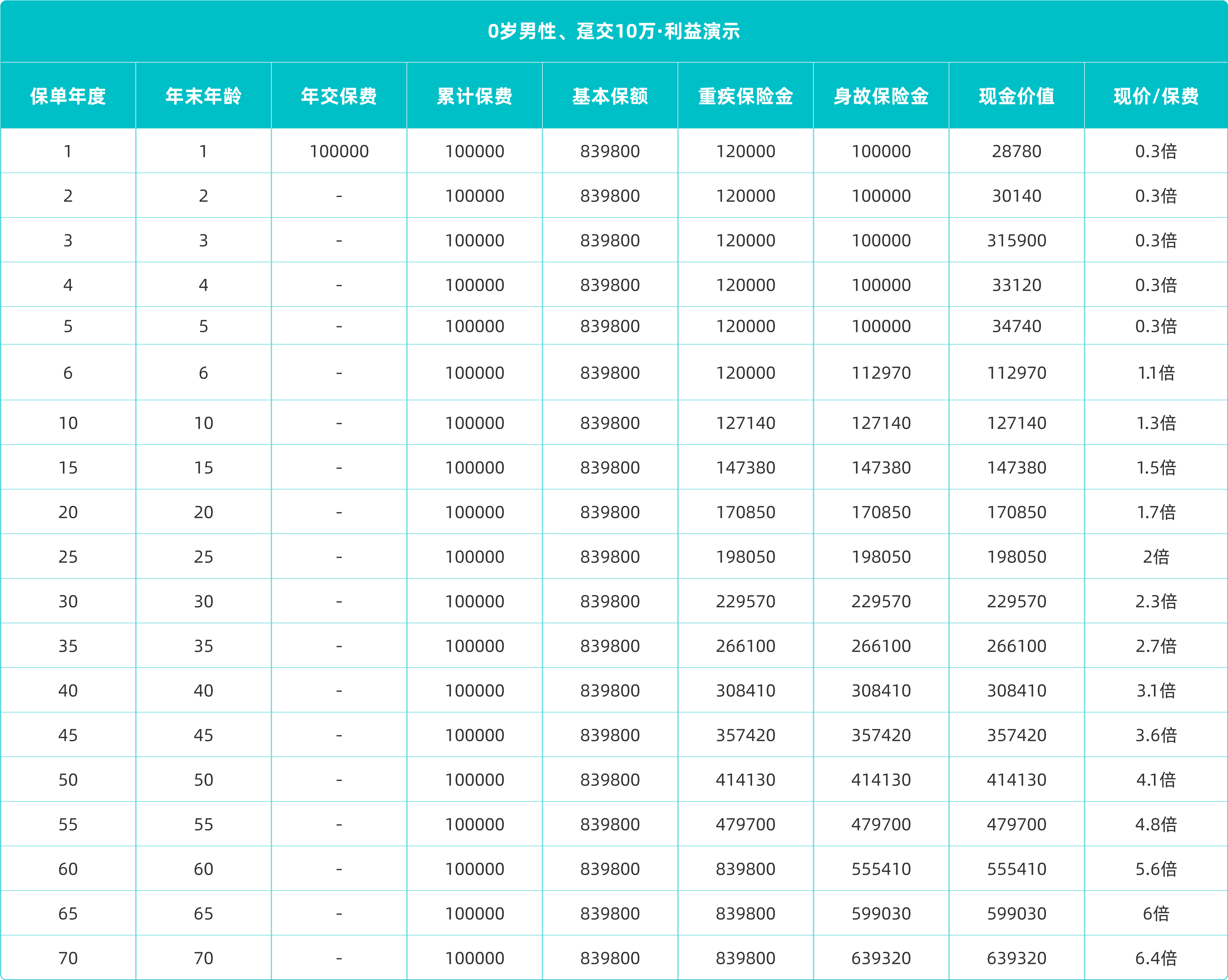 以0岁男宝为例,趸交10万元,到了70周岁,现金价值高达约63.93万,已达到了已交保费的6.4倍,重疾保额更是增长到了83.98万,达到了已交保费的8.4倍!