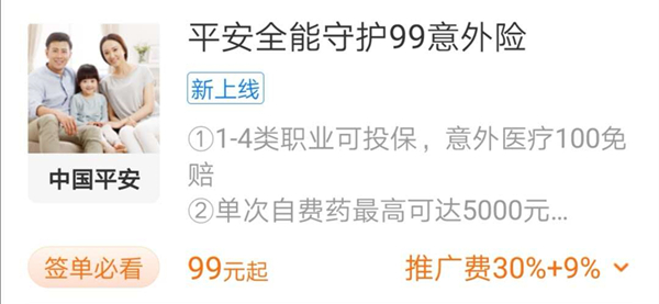 如此碾压市场的意外险,保费99元起,推广费居然还高达30%+9%,真是自买推广两相宜,快去一键转发客户出单吧!