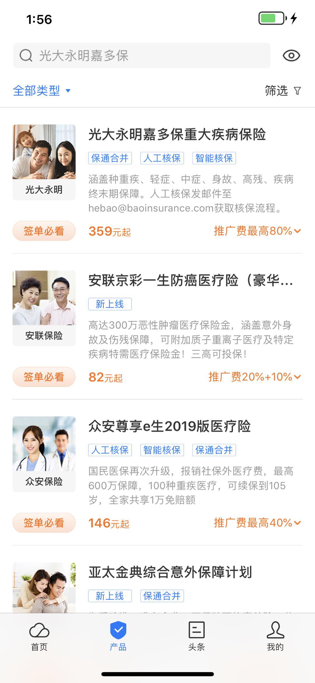 (例:众安尊享e生;众安个人综合意外险;众安孝欣保老年防癌险;光大永明嘉多保重疾险;复星康乐2019;华贵大麦定寿等等,详情请查看i云保APP产品页面。)