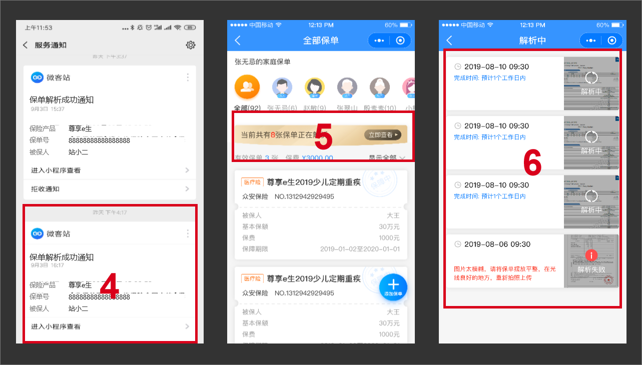 所以,为帮助老师们提升工作效率、创造更多与客户接触面谈的机会,我们在【微客站】中特别开发了一个新功能 ——【保单深度解析】。使用这个功能,只需上传一张保单照片,您就能获得准确率在 99.9% 以上的保单解析报告!