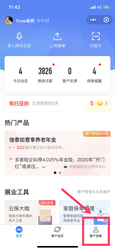 首先,我们在微信中打开【微客站】小程序,点击右下角的【客户档案】。