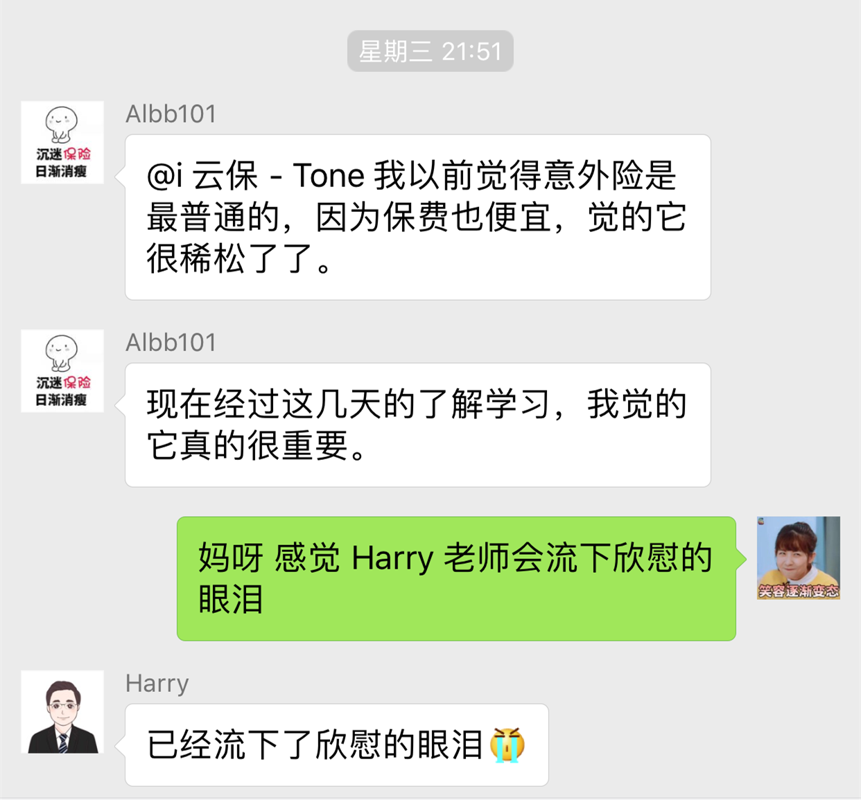 孙老师明明已经是非常资深的保险从业者了,还能够如此认真地学习基础知识,还会每天在群里鼓励大家,传播正能量…… 不夸张,这些天里班主任眼里饱含的热泪都是被孙老师感动出来的~!