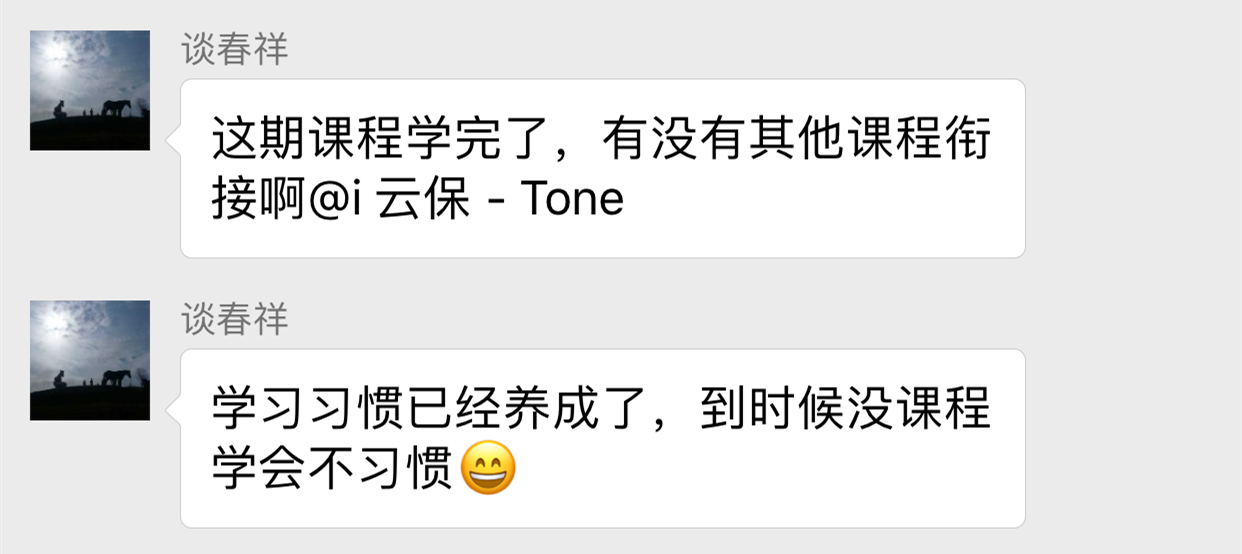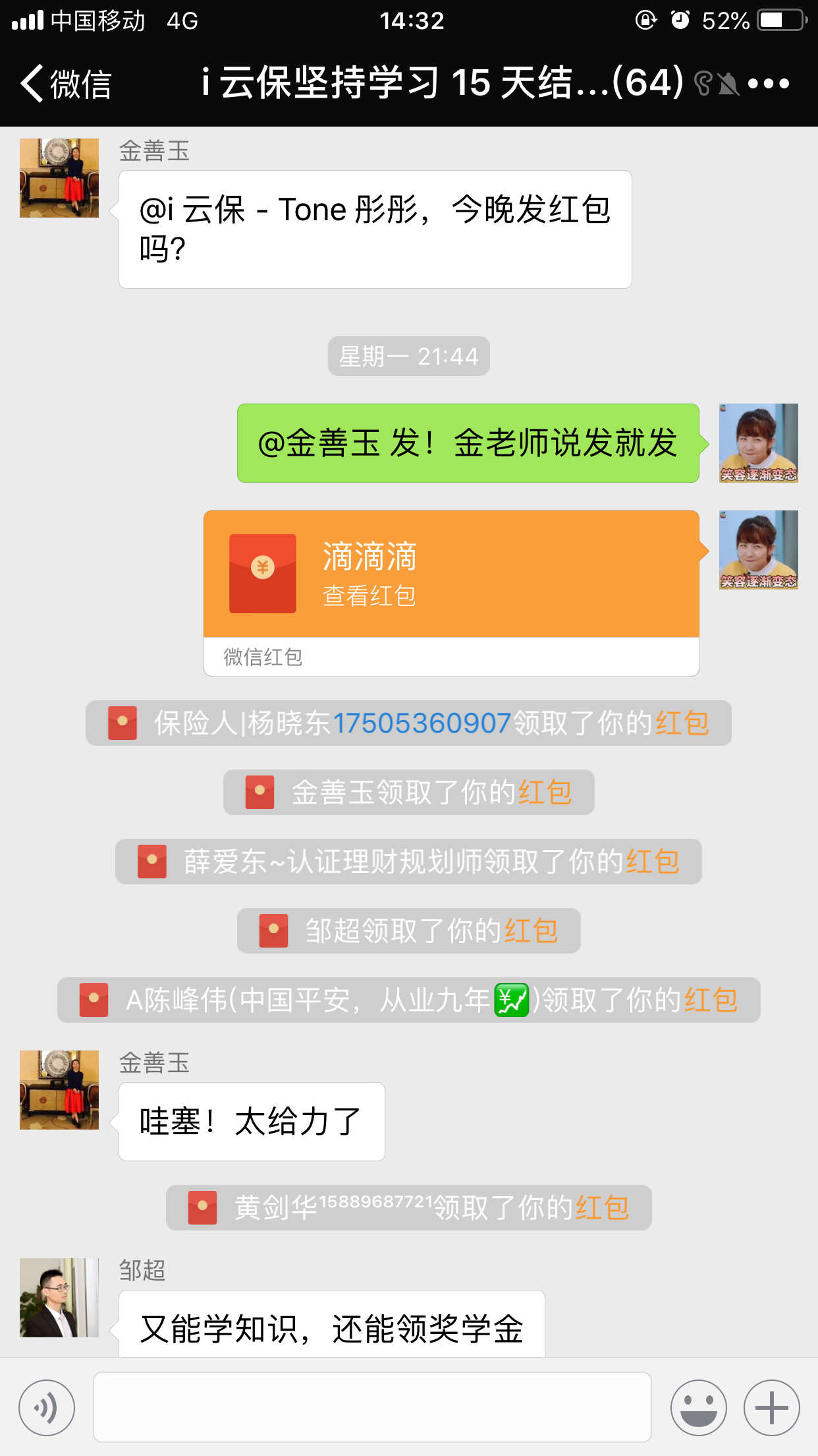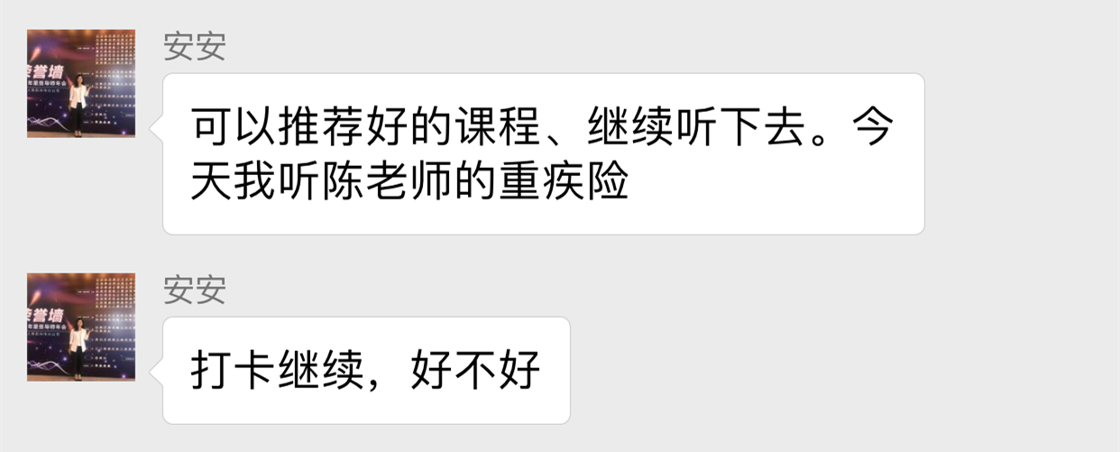在这 15 天里,学习群真的就像个班级一样。100 位来自不同城市、不同保险公司的老师们每天在群里 讨论课程内容、分享学习笔记、发表各自观点、相互检查作业(及讲师课件)…… 各位性格鲜明的会员老师,也给班主任留下了深刻的印象。