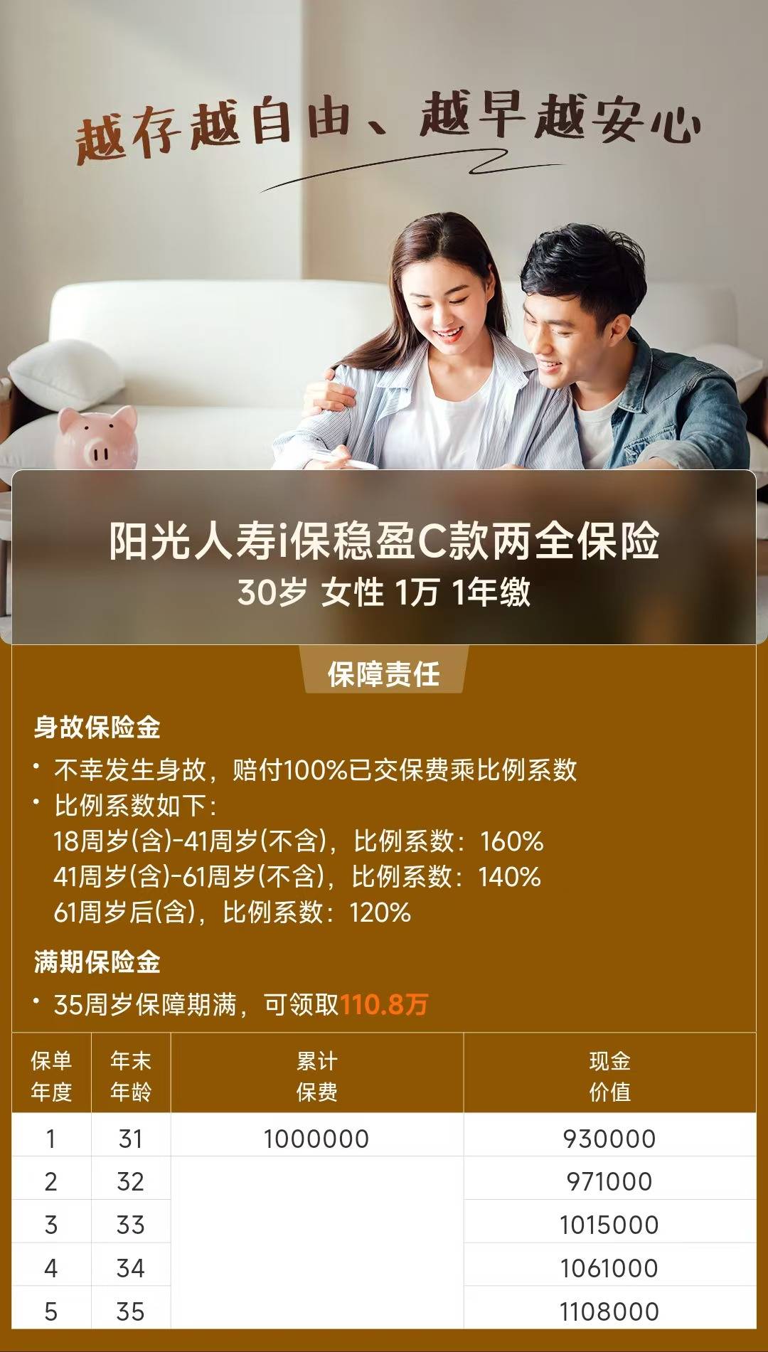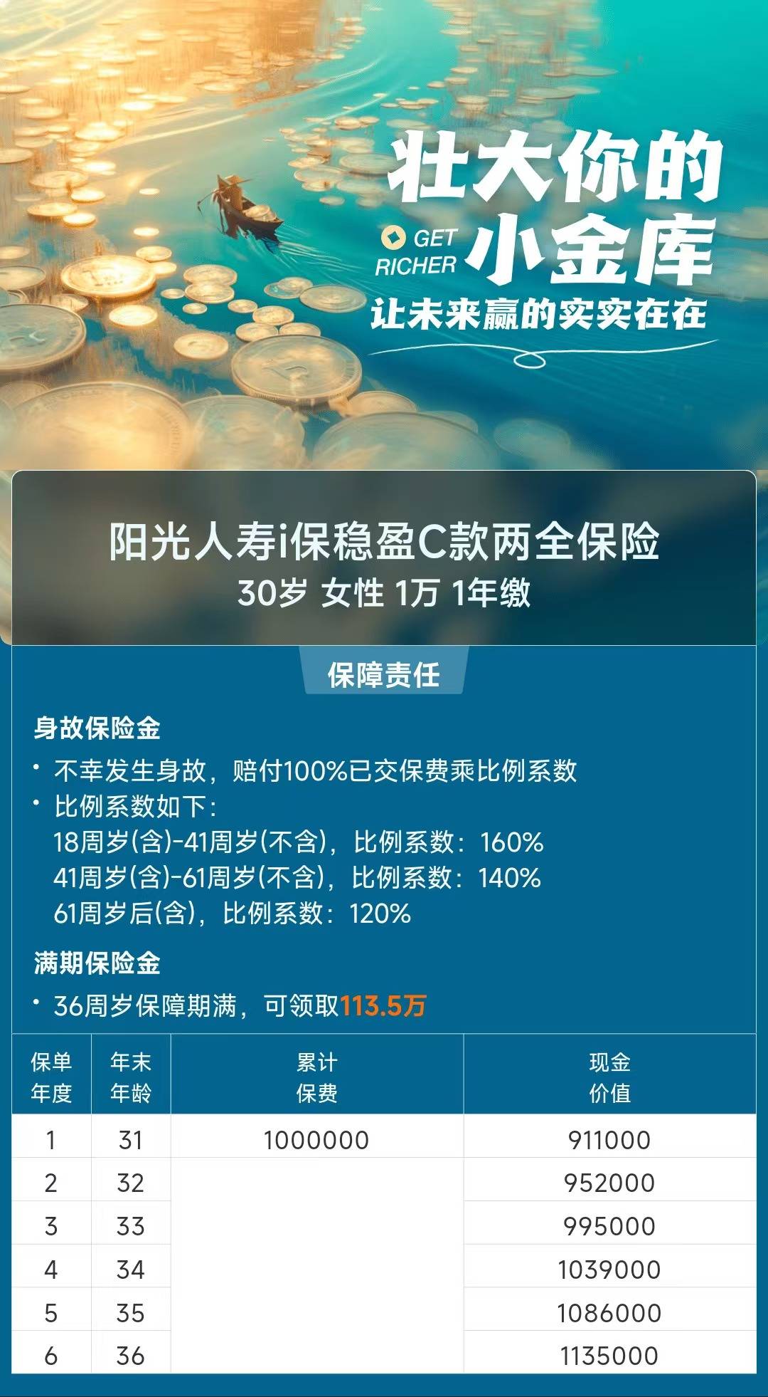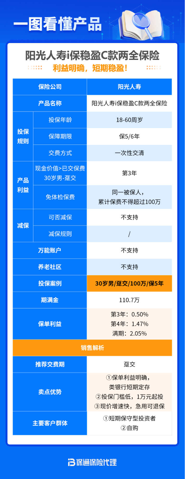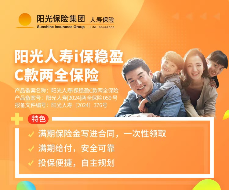 阳光人寿i保稳盈C款是一款短期类增额寿两全保险,保障期间可选5年或6年,保障期间发生身故,家人可获得一笔身故金,到期活得好好的,可领取一笔满期金,金额白纸黑字写入合同,利益也是100%确定!