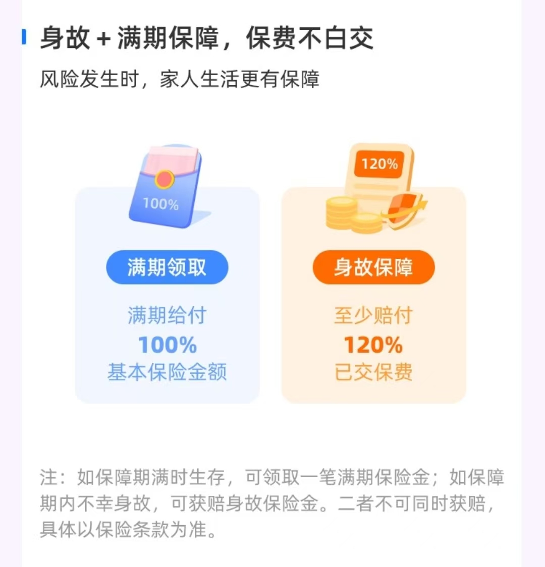 保单到期后,不用手动操作,满期金自动打款到账,省心又省力。若保障期间不幸发生身故,家人可一次性领到一笔身故金,弥补家庭经济损失。