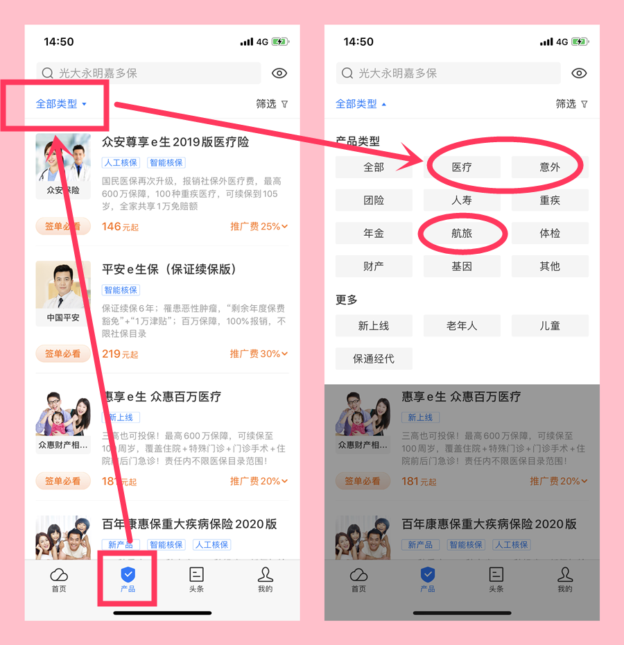 第二步:选择您要的险种:医疗险、意外险或航旅产品。选完就会显示出该险种下的所有产品。