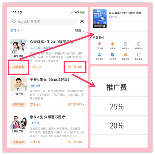点击【签单必看】,可以找到这个产品的所有资料,包括产品海报、介绍、费率表、健告、软文等。您可以直接转发给客户进行推广。