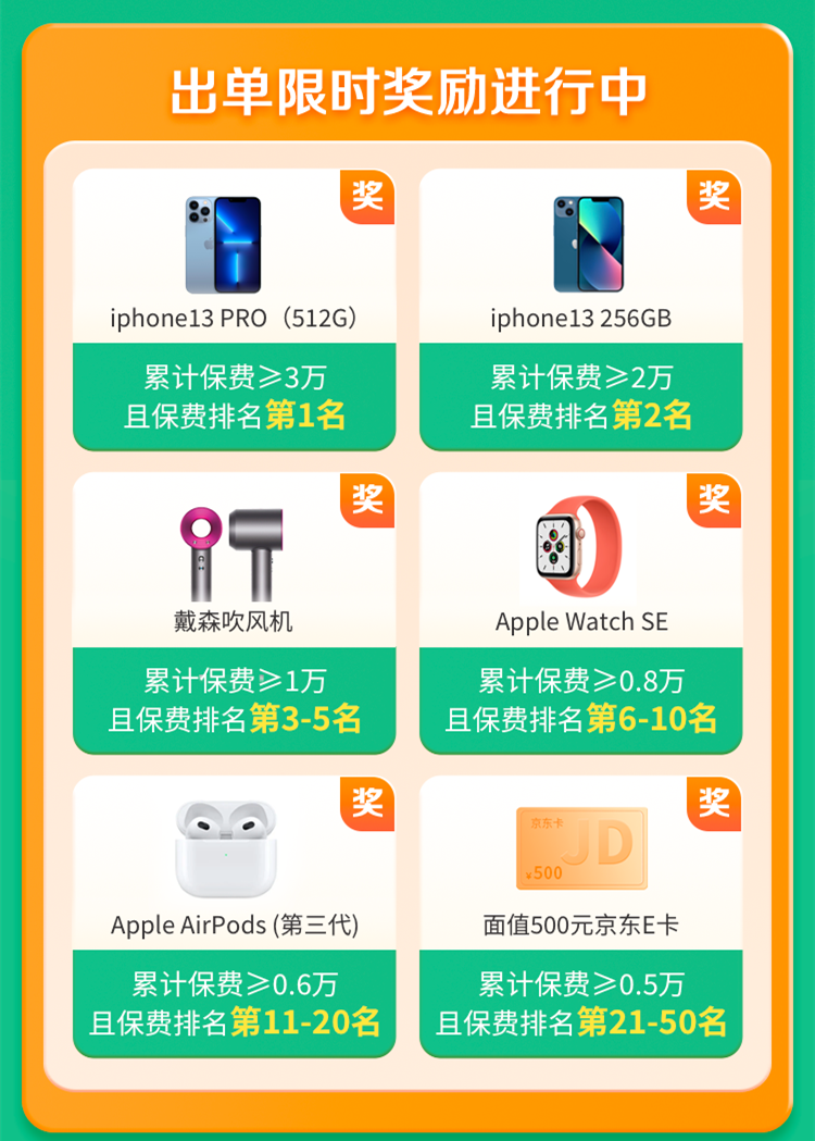 活动期间推广众安系产品,只要保费满足梯度条件、并达成保费排名,可获得实物奖励。奖励在活动结束后 45 个工作日内统一发放。