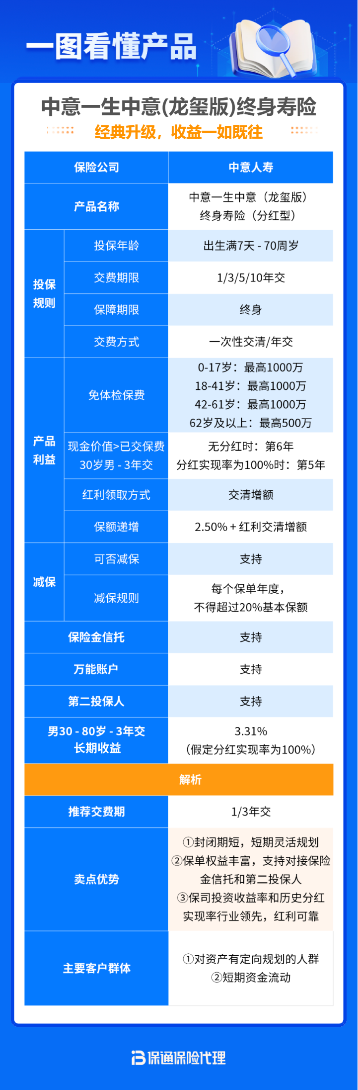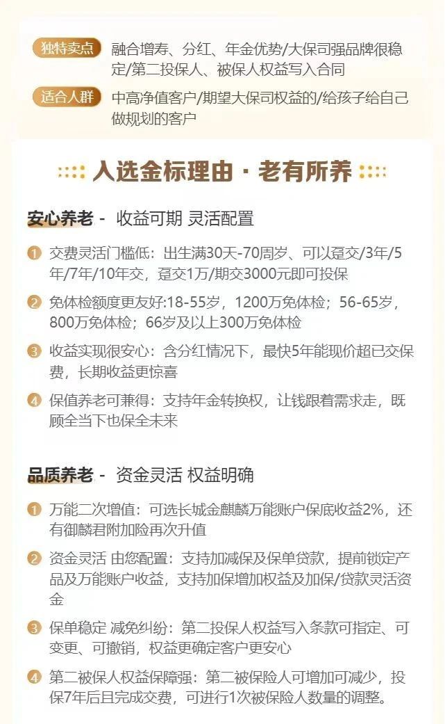 产品本身也很出色,趸交最快5年现价超保费,长期收益有望稳定在3.6%,0-70周岁均可投保,且支持隔代投保,还支持第二投保人,可对接信托,满足更多人的需求。