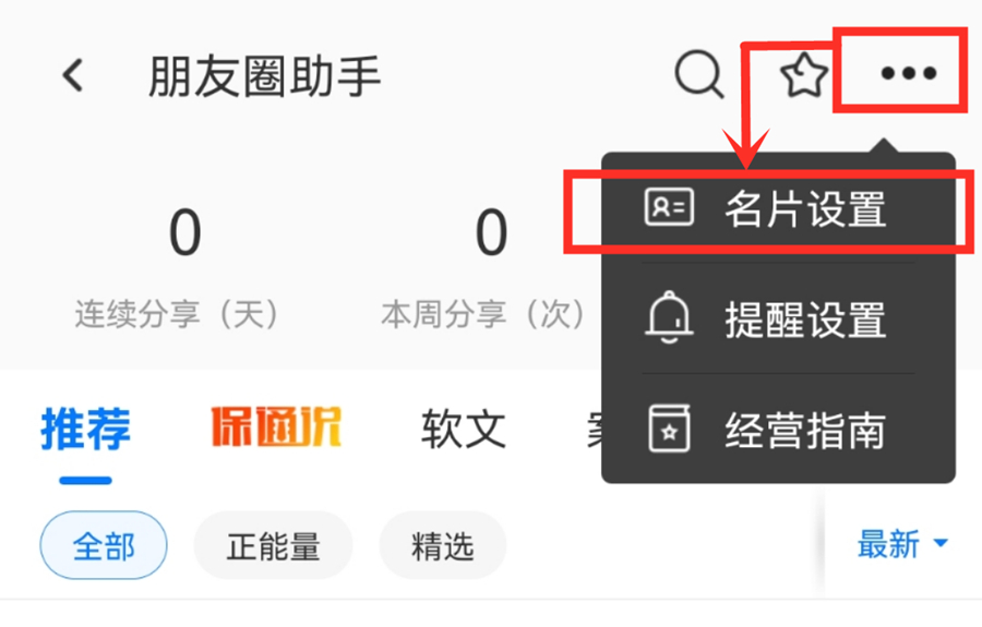 同样是在【· · ·】里,点击【名片设置】,就可以选择关闭素材里的签名。