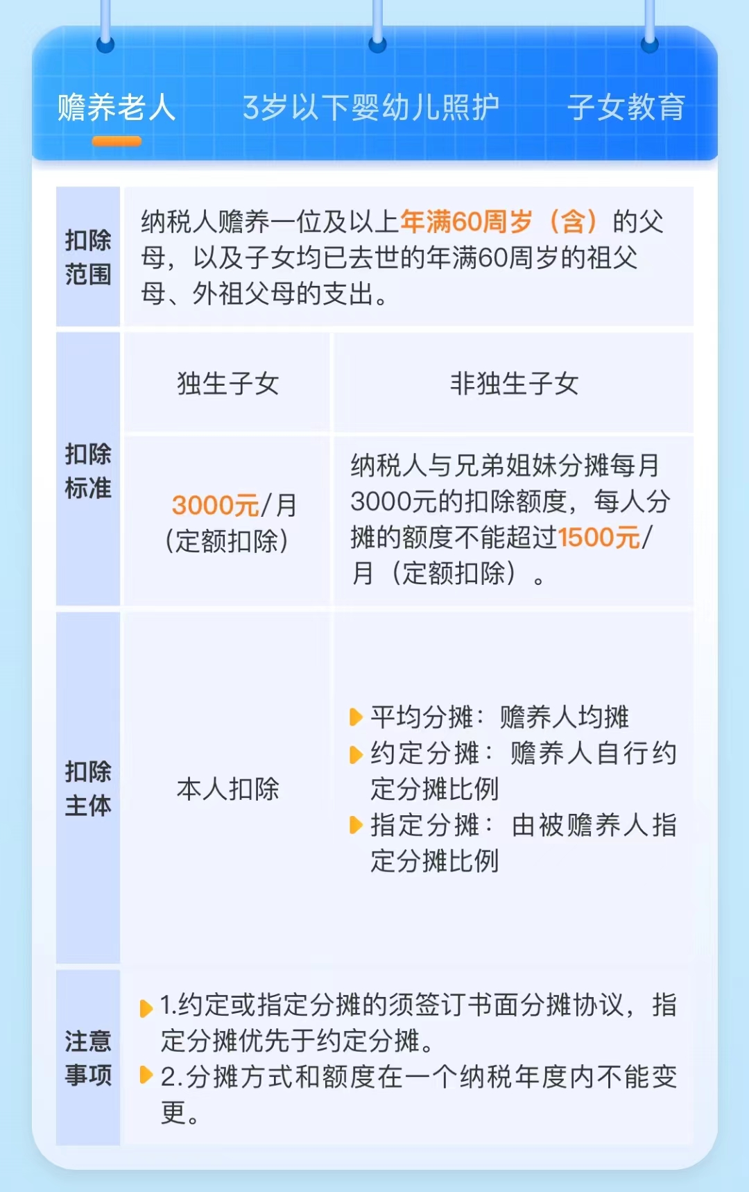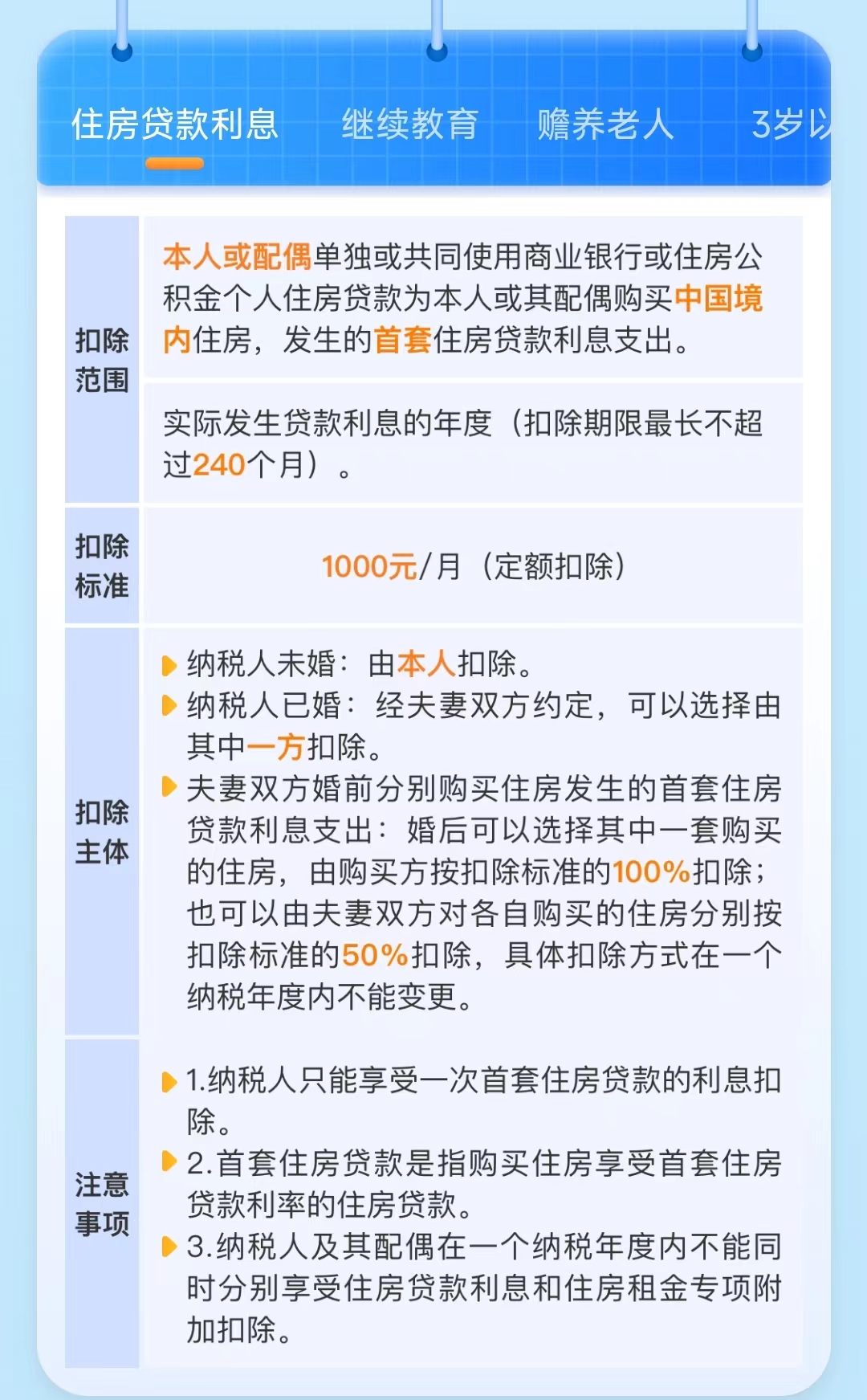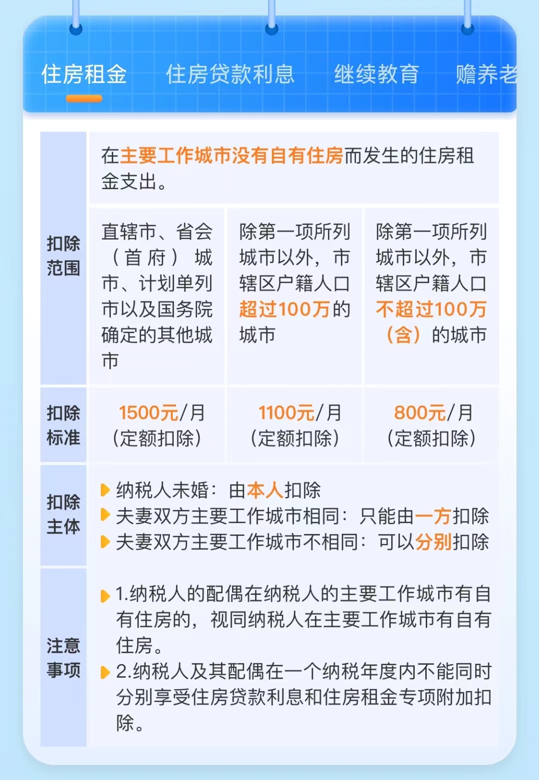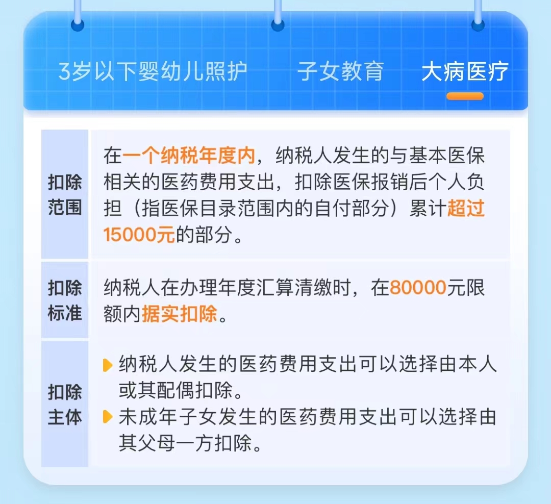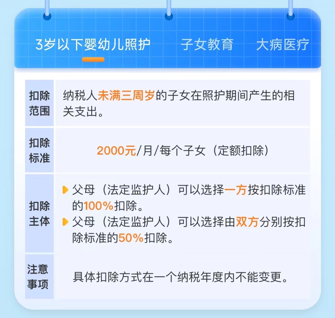 其中,【住房贷款利息和住房租金】二选一,同一个孩子【子女教育和3岁以下婴幼儿照护】二选一,其他都可以叠加扣除,如果你有,记得一一申报,退钱的机会更大!