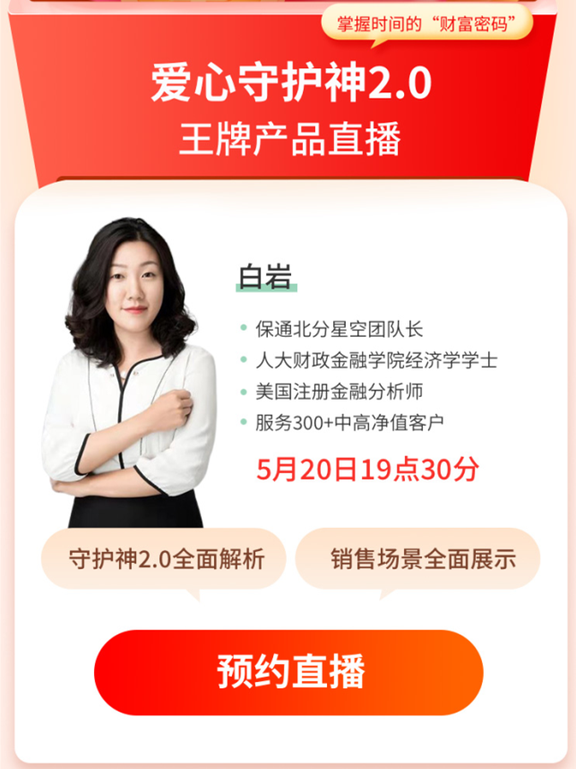 这天晚上 ,我们将特别邀请来自保通北分星空团队长、中国人民大学财政金融学院经济学学士 —— 白岩老师作客保通直播间,来为我们解析这款产品的卖点和优势、手把手教你出大单!