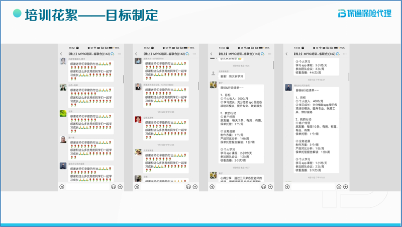培训结束也是行动的开始,参训伙伴纷纷在群内树立目标,要将保单托管工具在工作中实践,学以致用。只有不断充电输入,抓住公司提供的学习机会,才能跟上行业潮流。