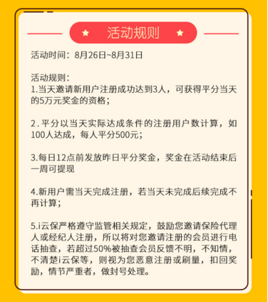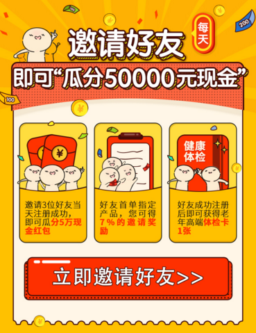 当天只要有 3 位好友通过您的链接成功注册 i 云保,您就可以参与瓜分当天的 50000 元奖金!而您的好友也可以得到一张老年高端体检卡作为注册奖励。