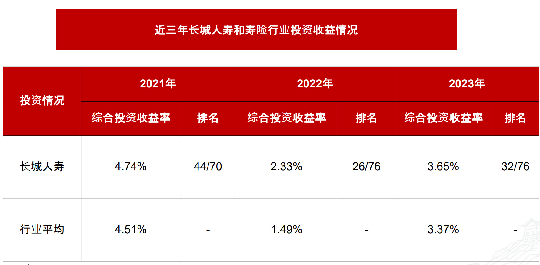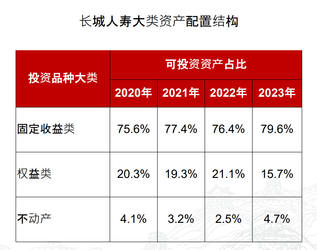长城人寿资产稳定性、安全性有较高保障。资产配置结构以固定收益类为主,权益类为辅。截至2023年末,固定收益类资产占比接近80%。近三年长城人寿投资业绩持续战胜行业平均水平。