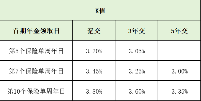 之后每年领取金额=累计已交纳的保险费(无息)×K值×年金领取方式对应比例