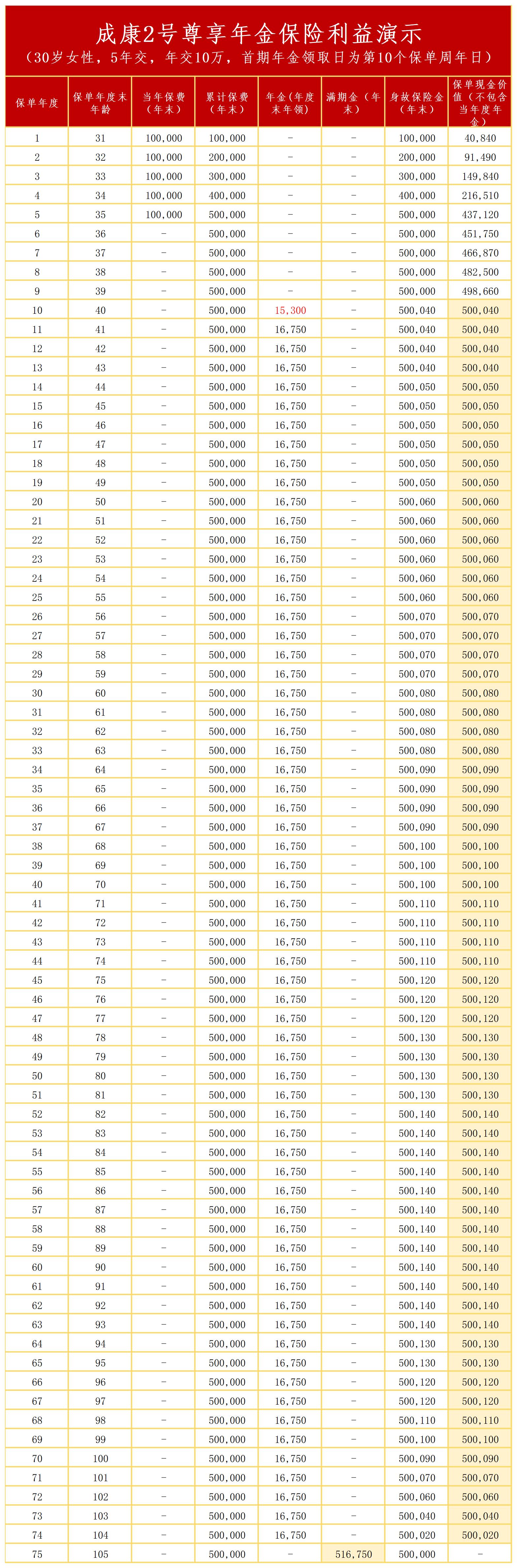 成康2号尊享年金保险每年领取金额100%确定,不受市场利率波动影响!尊享计划,年金开始领取后,每年现金价值与已交保费基本持平,已交保费可通过退保获取或身故理赔,相当于交纳的保费一直都在,身价有保障,满足领取需求!