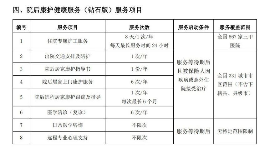 包括每年8天的住院专属护工、每年6次的院后居家上门康护、每年6次的医学陪诊(复诊),不用额外花钱,全部都可免费享受!