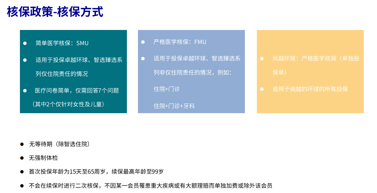 投保及理赔规则:65周岁以下客户投保无体检要求,无需提供体检报告,领先的智能核保(除未如实告知情况),客户可连续投保至99周岁,不区分有无社保,有社保身份无社保报销理赔时也可100%理赔。