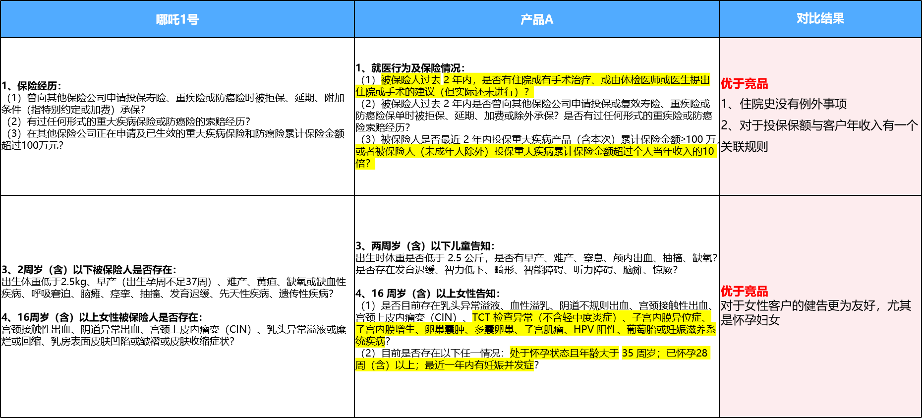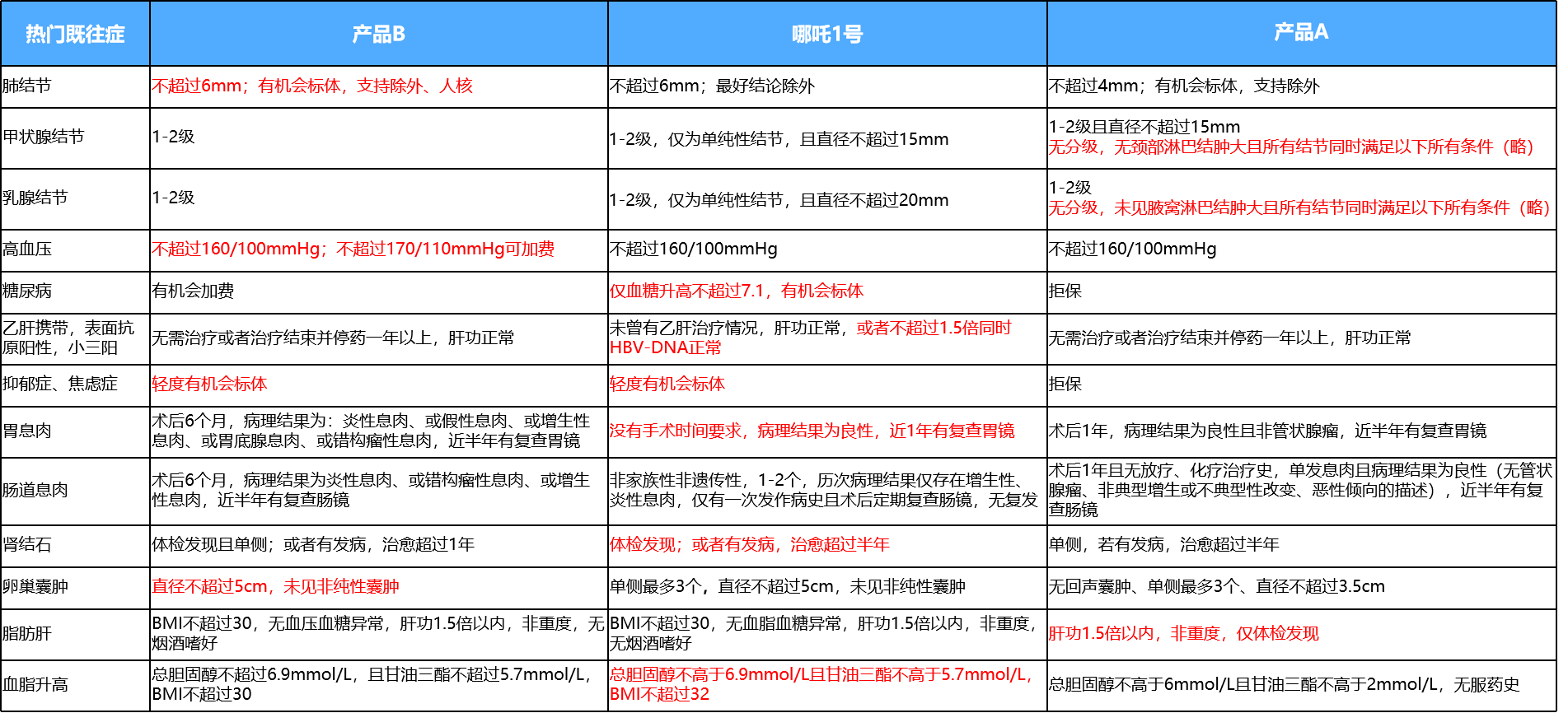 核保老师将哪吒1号与产品A、B的健康告知内容进行了详细、专业的对比:
