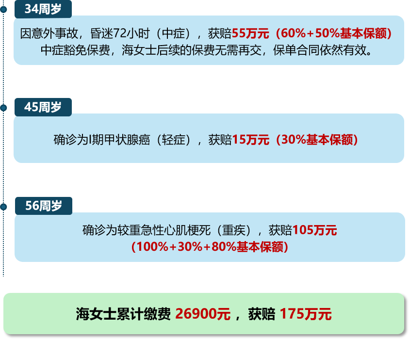 合计最高额外赔付100%基本保额,首次确认重疾+持续5年治疗状态,可获赔200%基本保额。