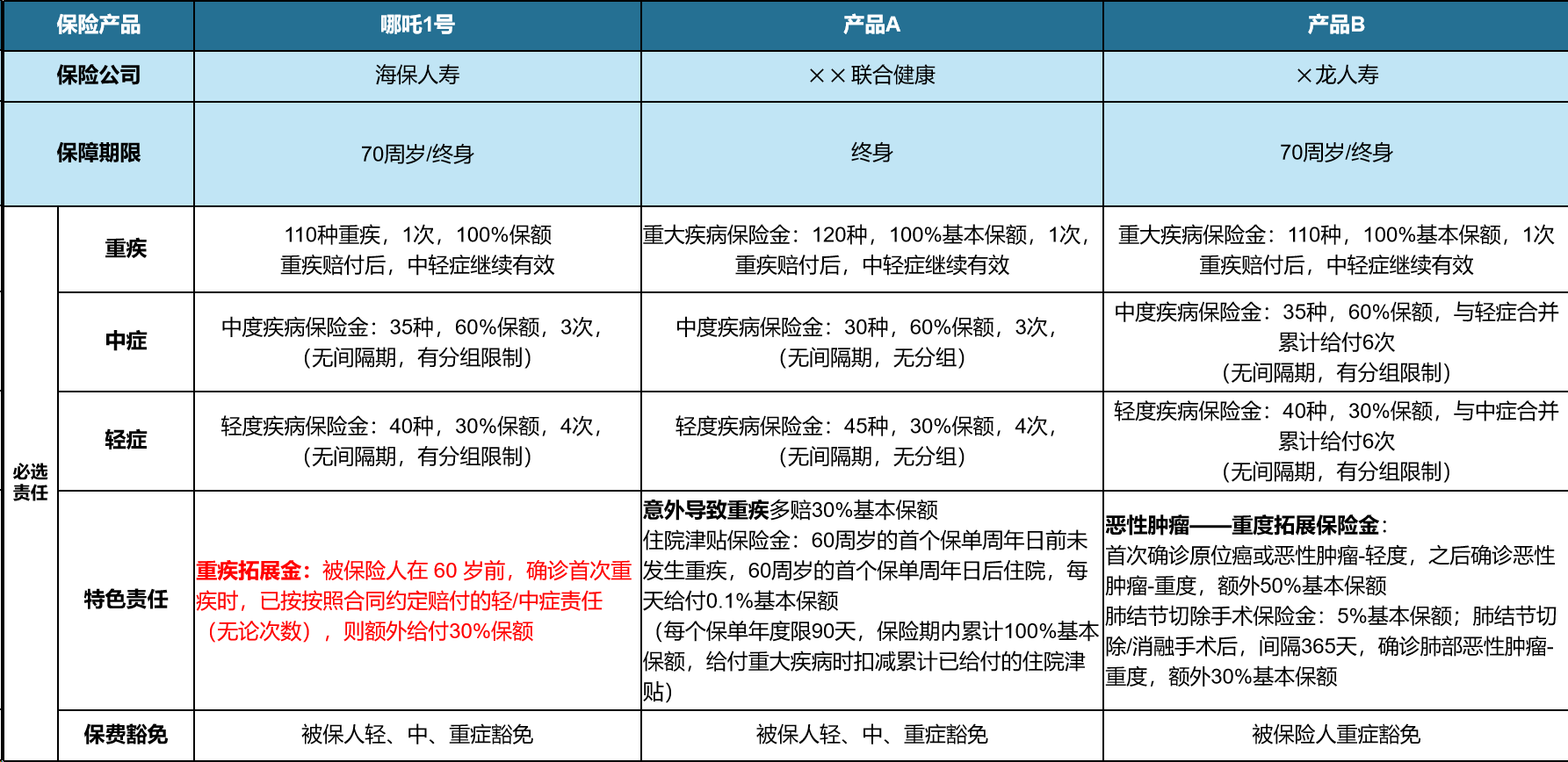下面从3个维度,将哪吒1号与两款市场同类互联网重疾险产品进行对比,分别是产品责任、价格、以及大家非常关心的核保尺度。