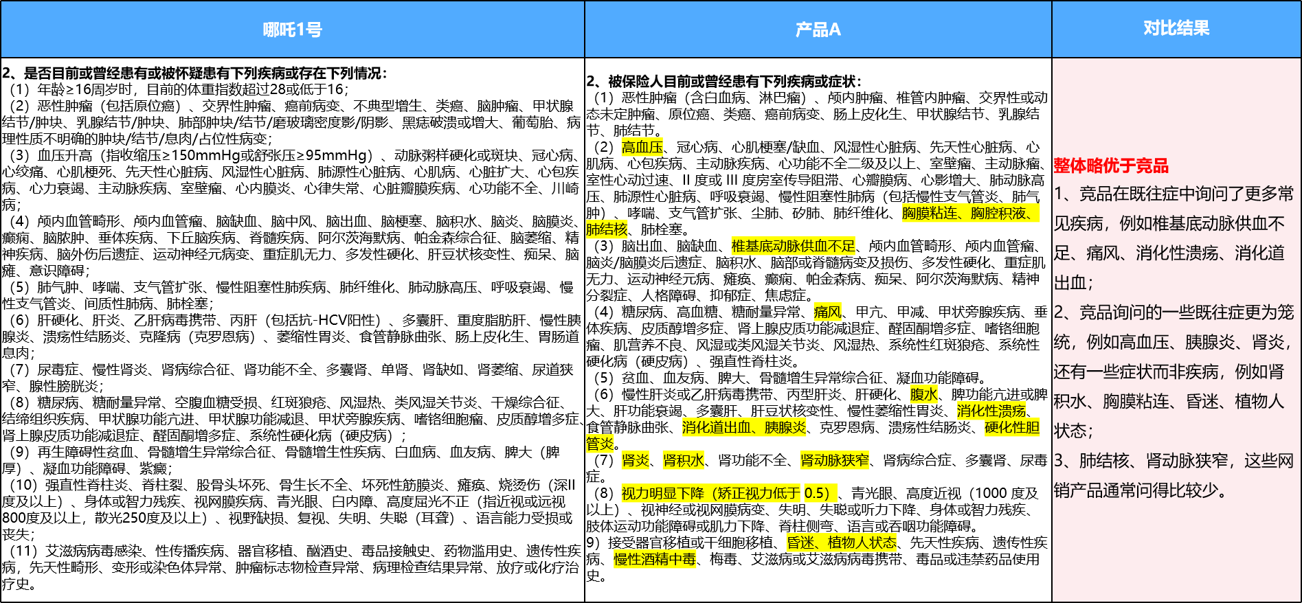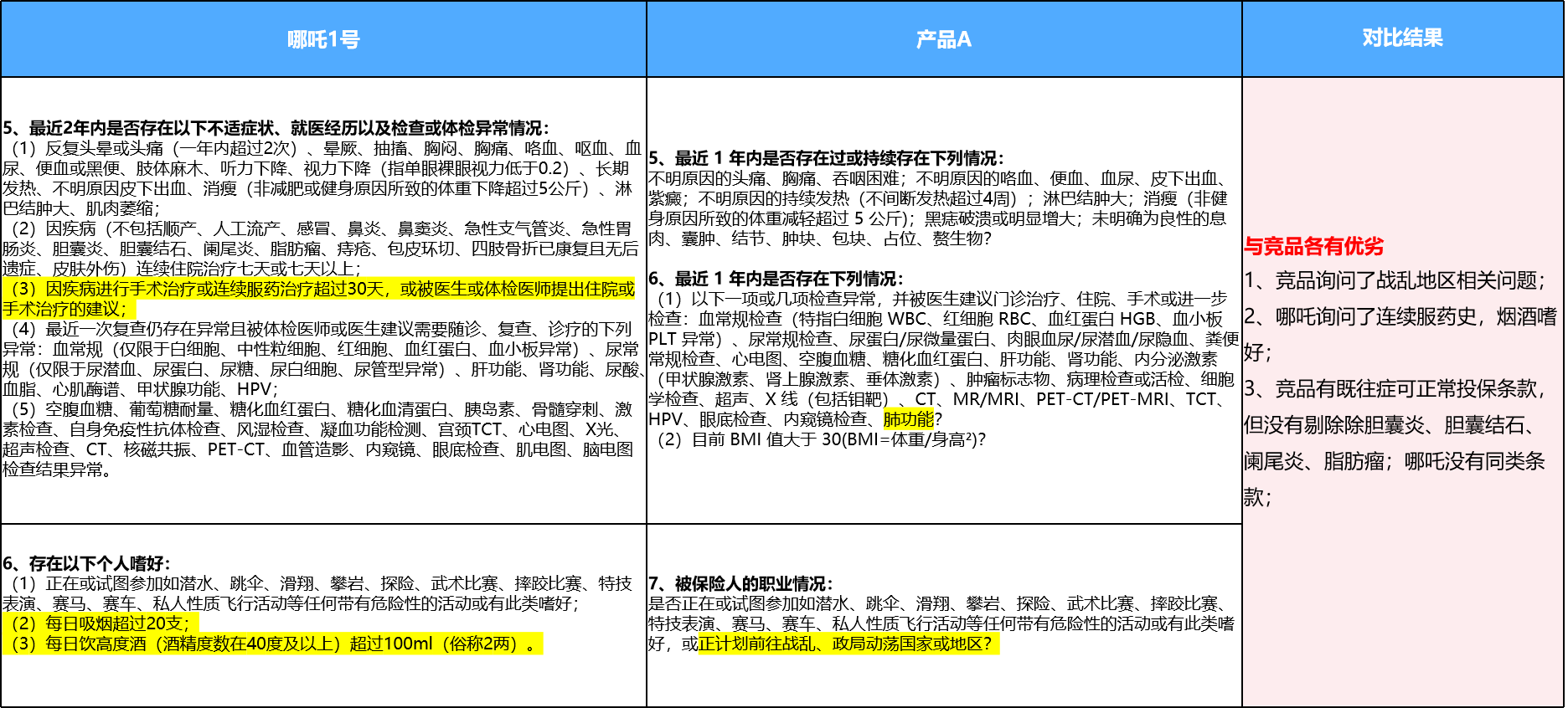 在健康告知的问询尺度上,哪吒1号整体优于竞品。