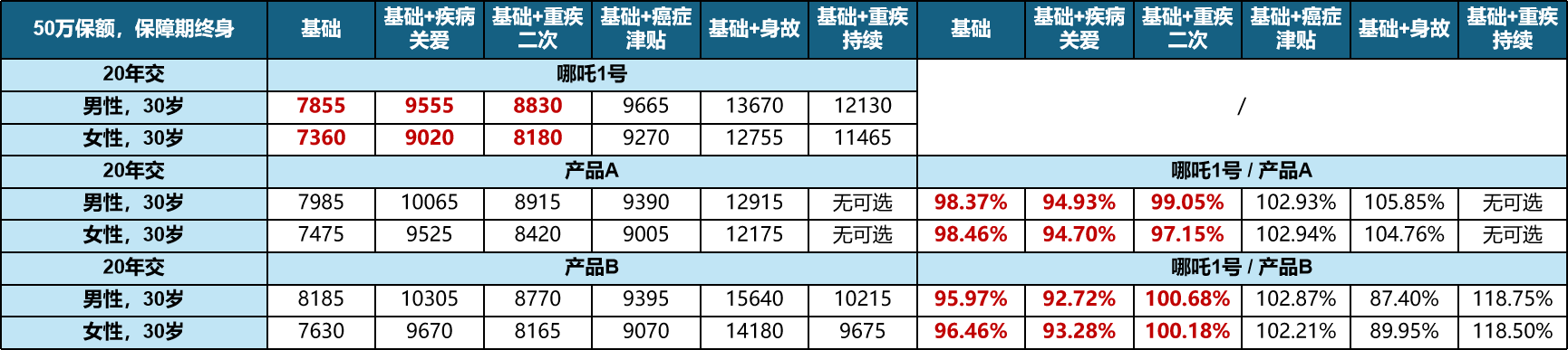 二次重疾费率优势:哪吒1号二次重疾的保障期延长至70周岁前,费率较产品A低1-2%,与产品B持平,加量不加价!