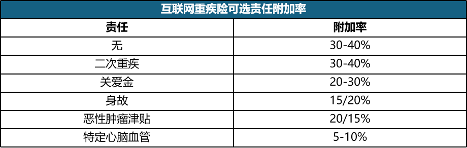 哪吒1号之所以在基础责任、疾病关爱金责任、二次重疾责任上做极致的性价比,我们先看下面一组数据,图为互联网重疾险可选责任的附加率: