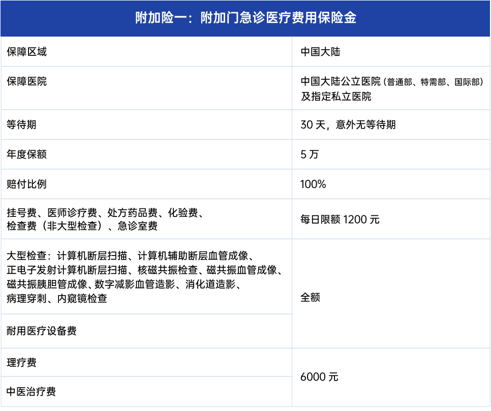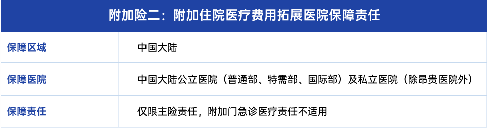 拓展主险的医院范围至中国大陆(不包含香港、澳门、台湾地区)的除昂贵医院以外的私立医院,仅限主险责任,附加门急诊医疗责任不适用。