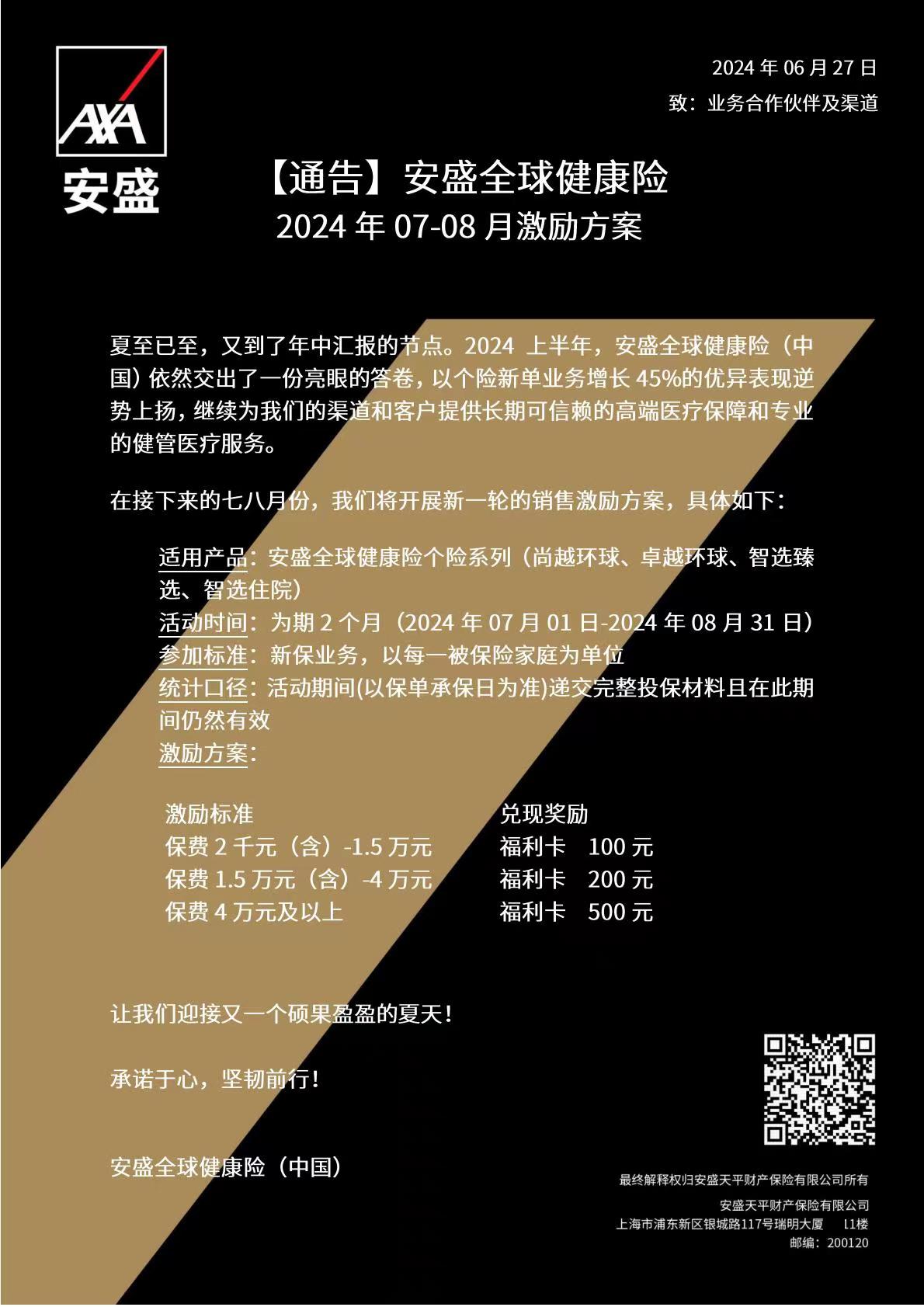 2024.7.1-8.31期间,出单安盛全球健康险个险系列(尚越环球、卓越环球、智选臻选、智远住院),每出一张新保保单(以每一被保险家庭为单位),累计新单保费达标,可获得对应的福利卡奖励,以下奖励取最高获得: