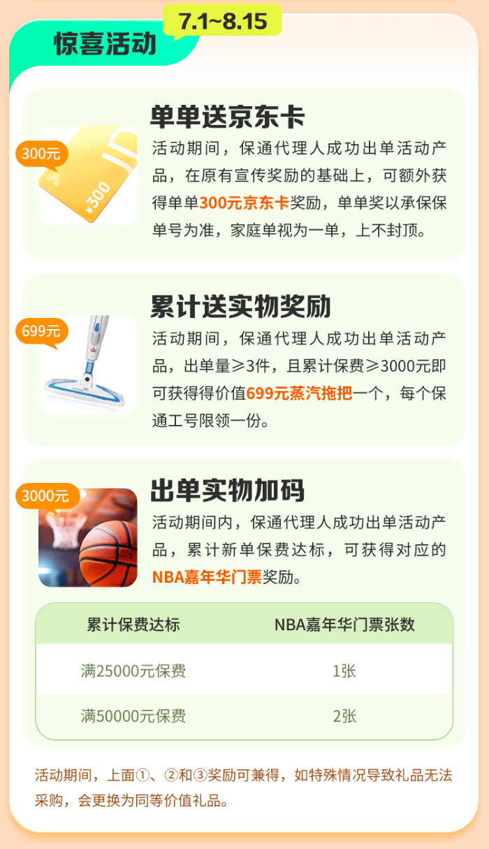 活动期间,保通代理人成功出单活动产品,累计总保费≥2.5万,可获得NBA嘉年华门票1张;累计总保费≥5万,获得NBA嘉年华门票2张;单个出单账号最多可获得两张门票。