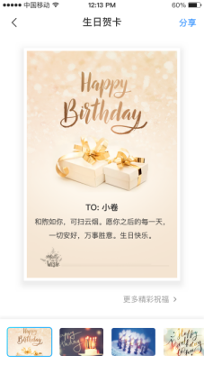 您在客户列表中点击近期生日的按钮,就能看到相关客户列表。在列表中点击客户名字后面的【送贺卡】,就能进入贺卡编辑页面。