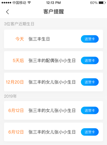 本次升级保留了 30 天内的客户生日提醒,同时增加了被保人的生日提醒和生日电子卡的功能。
