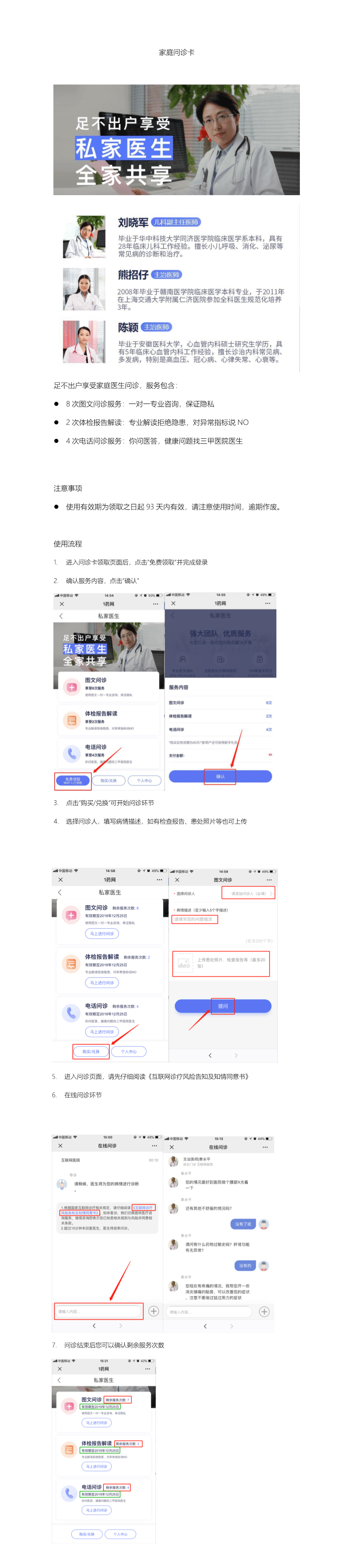 如有不适症状可线上直接对接三甲医院医生,做到足不出户享受私家医生。共包含8次图文问诊,2次体检报告解读,4次电话问诊服务,连家人也可以一起使用!