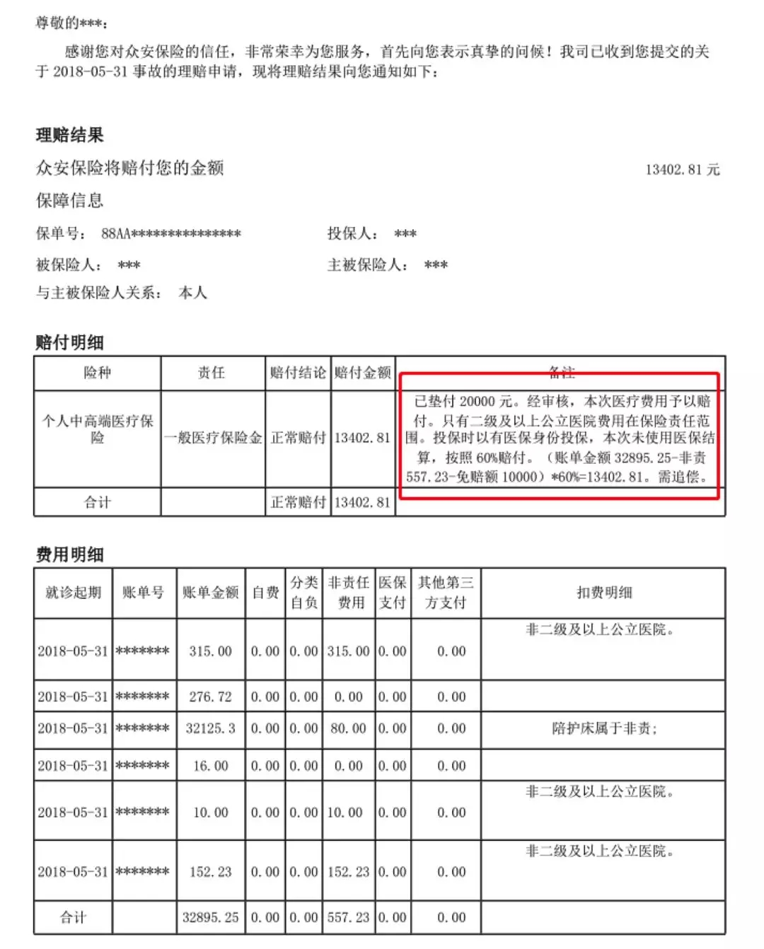 通过上图理赔通知书可以看出,在本次住院医疗中,医疗费用共计32895.25元,去掉非责费用和免赔额的1万元,剩下的费用按照60%进行赔付,即13402.81元。