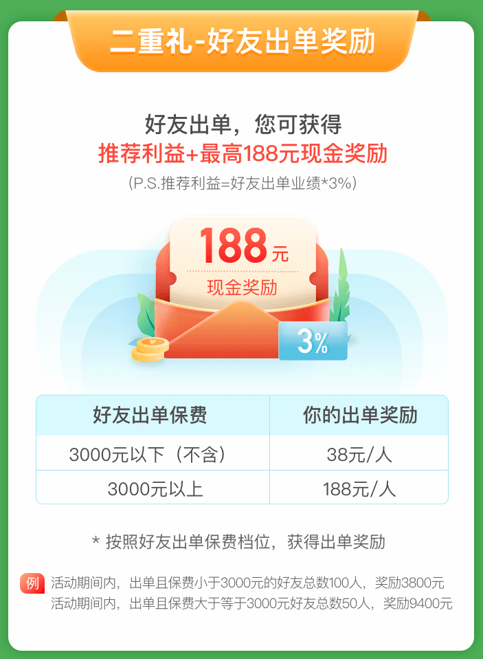 (2)出单奖励:邀请好友在活动期间内注册并入职保通,且出单,根据其保费与人数,您可以获得以下奖励:a. 好友保费小于 3000 元,奖励 38 元 / 人;b. 好友保费大于等于 3000 元,奖励 188 元 / 人。