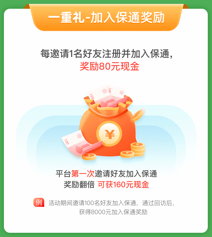 (1)保通入职奖励:邀请好友在活动期间内注册并入职保通,可获得 80 元 / 人的奖励;若您在活动开始前从未邀请过好友注册过 i 云保,那么活动期间内邀请第 1 位好友注册并入职保通,可享受 160 元的奖励,后续则为 80 元 / 人。